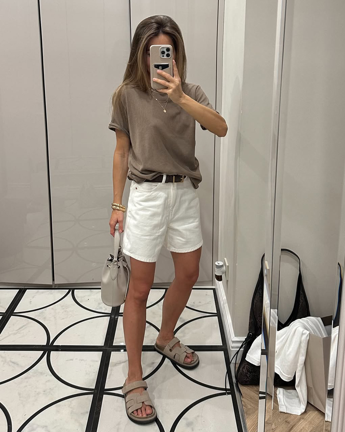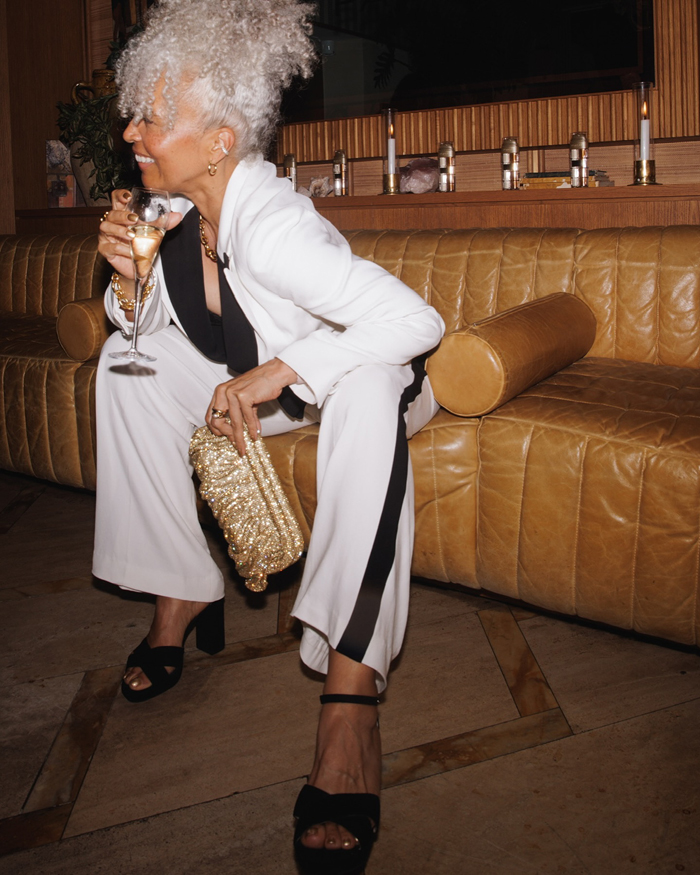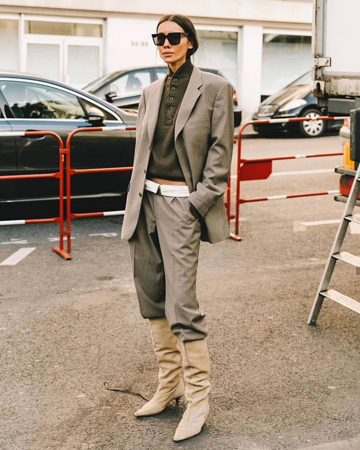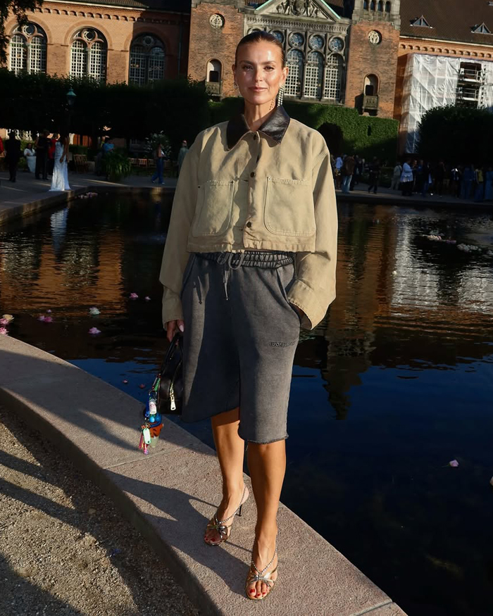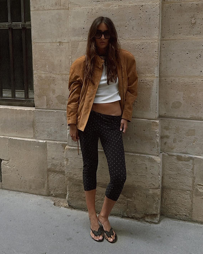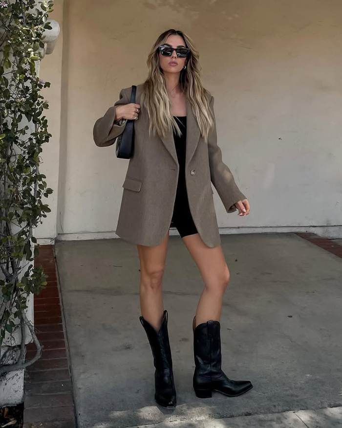 We’re seeing cropped jackets, oversized blazers, and bold proportions taking center stage. One standout look pairs a suede bomber with a crisp white crop top and polka-dot capri leggings for an off-duty vibe that’s chic without trying too hard. Another takes tailoring to the next level with a checked skirt-suit styled over a daring plunge leather top and sharp heels—proof that power dressing can be both sexy and sophisticated. Then there’s the blend of Western and minimalism: biker shorts and an oversized blazer made fresh with sleek cowboy boots, a pairing that feels equally modern and timeless.